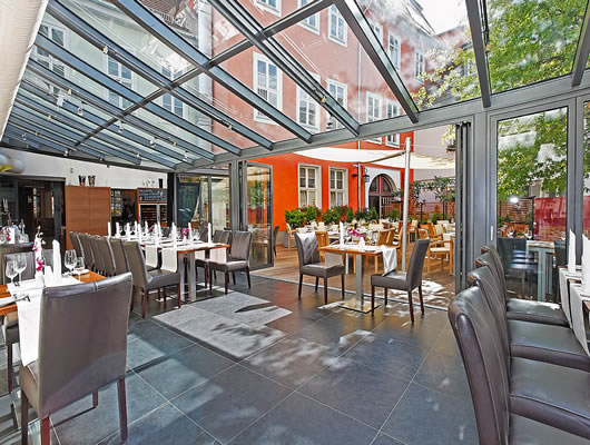 Renovierung eines groÃ?en Stadtanwesens zu einem Multi-Gastro-Konzept, bestehend aus Vinothek, Wirtshaus, Restaurant und Garten.